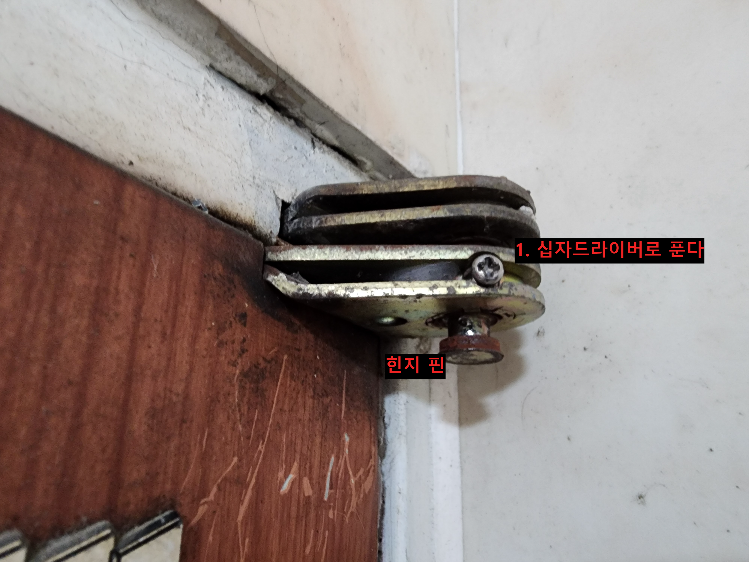 문이 생각처럼 그렇게 무겁지는 않으니 옆 벽에 잘 기대 두시고 아래쪽 힌지를 보겠습니다.