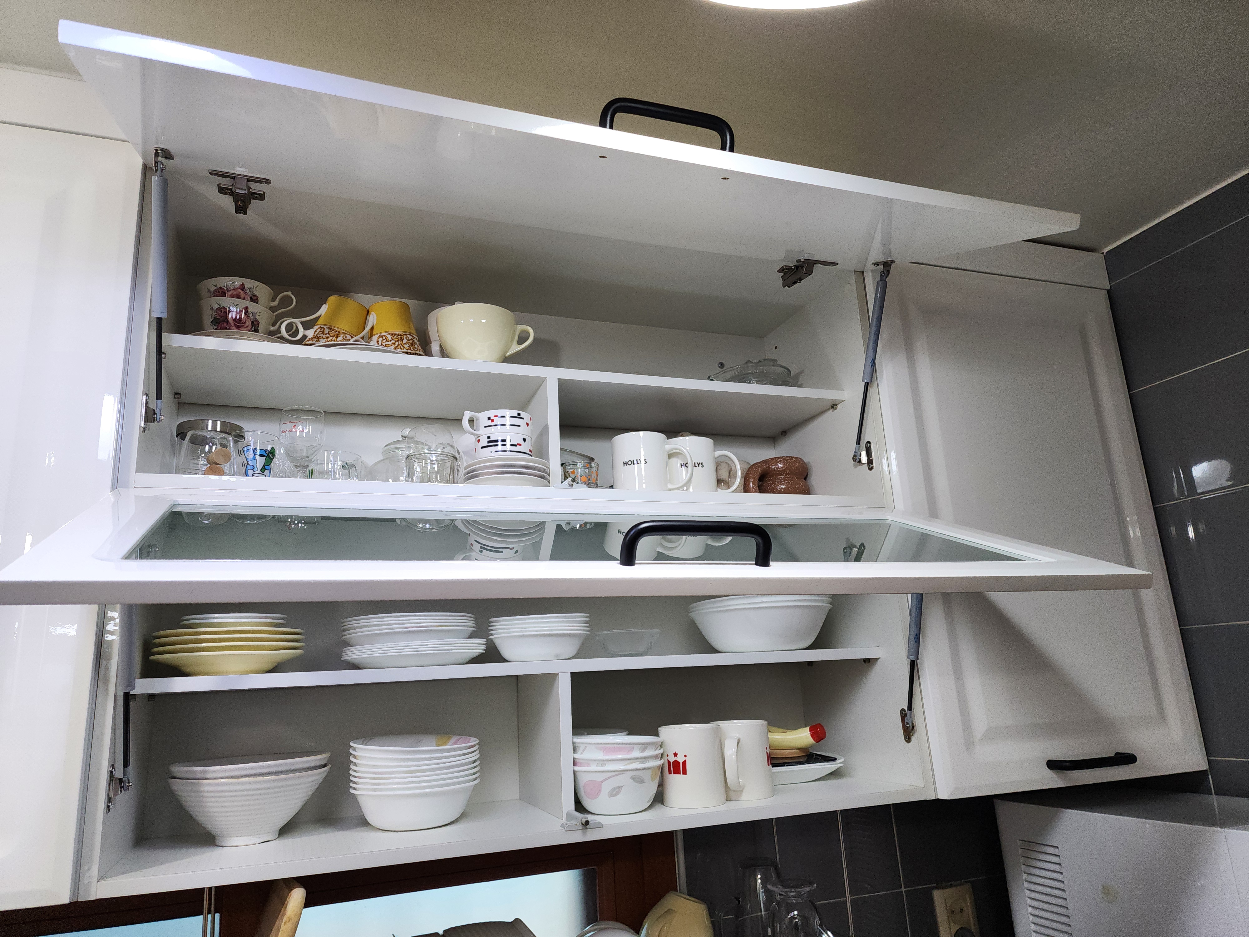 싱크대 상부장에 도어를 위로 열리도록 만들어진 플랩장인데요.